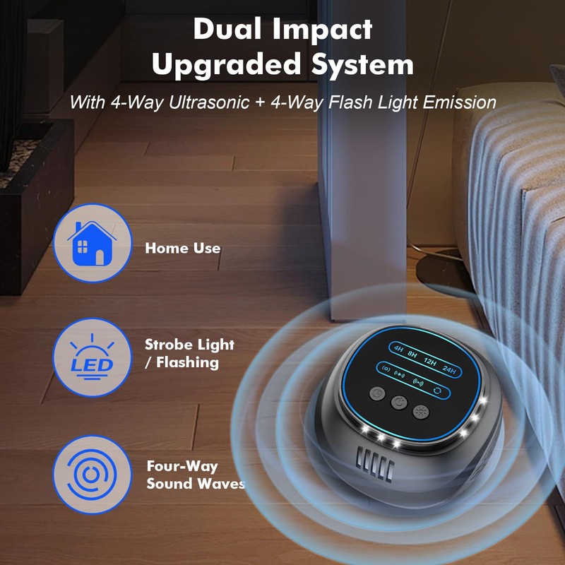 The Technohom indoor ultrasonic device combines audio signals in the 20KHZ to 65KHZ range with an optional LED light component. With four selectable sound patterns, the unit allows flexible operation across various indoor settings. Mode 4 all offer a cycling combination of all sound patterns. The LED flashes approximately six times per second and is synchronized with the current sound mode and timer duration. Users can choose between four operation periods: 4, 8, 12, or 24 hours. All settings are easily controlled using the single-button interface and are visually confirmed with LED indicators. This device is designed for enclosed indoor environments and may cover areas up to 300㎡ (≈3229 sq.ft), depending on structure and layout. For larger or segmented spaces, additional units may be used. Technohom offers a practical and easy-to-use solution for maintaining indoor environmental comfort with multi-mode support and clear visual operation.