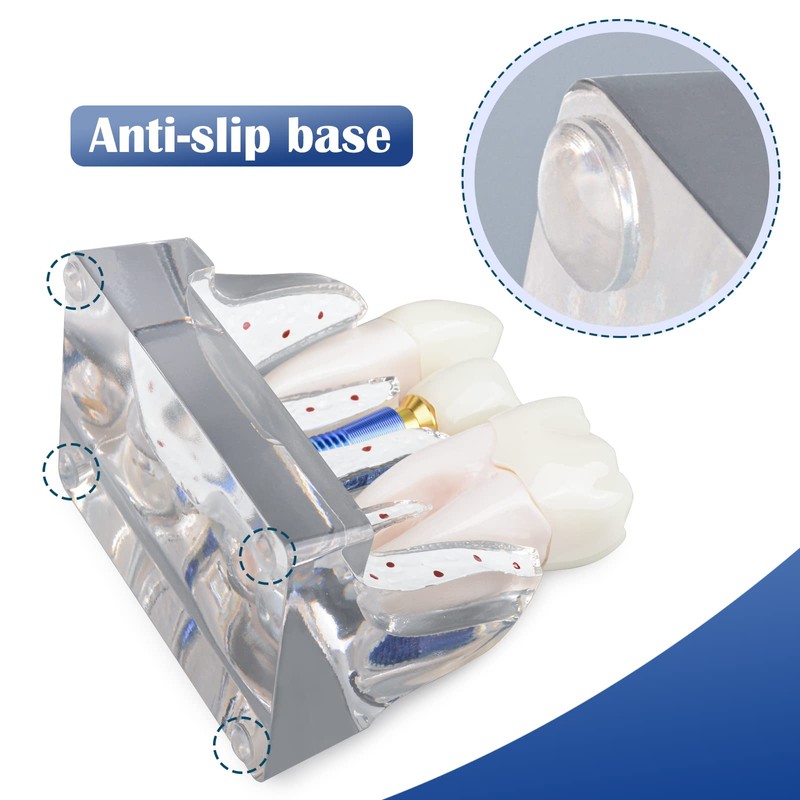 - La base transversal del hueso gingival es conveniente para que los médicos muestren la estructura de los dientes al paciente. También muestra la relación integral entre el implante y la raíz. La parte inferior del modelo de implante dental transparente cuenta con una base antideslizante que proporciona fricción en las superficies de la mesa. Esto evita que el modelo se deslice o se deslice.