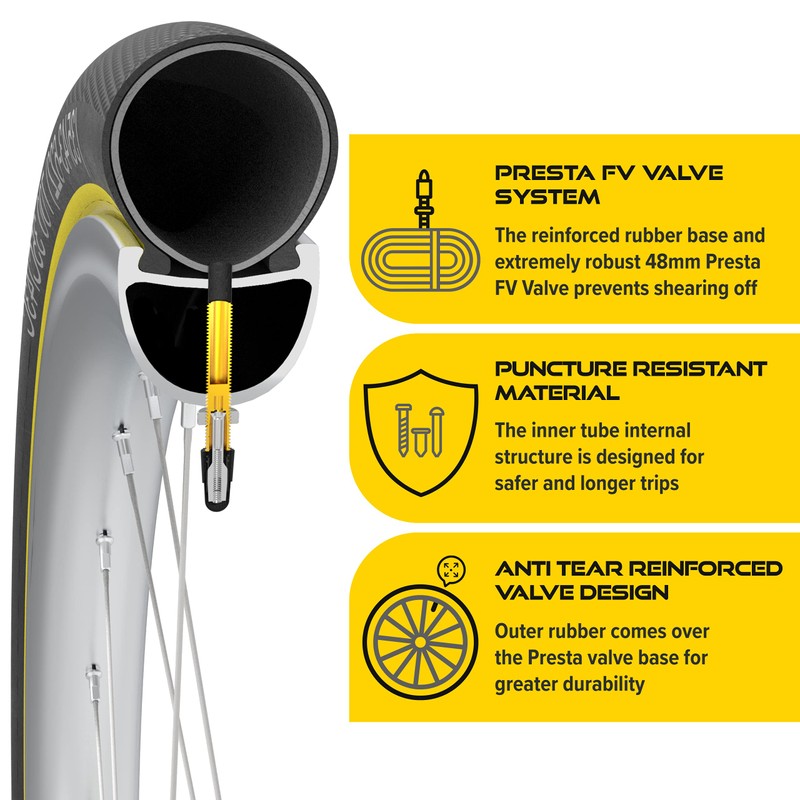 - Presta Valve – The heavy duty reinforced rubber base and extremely robust 48mm FV Valve prevents shearing off while cycling