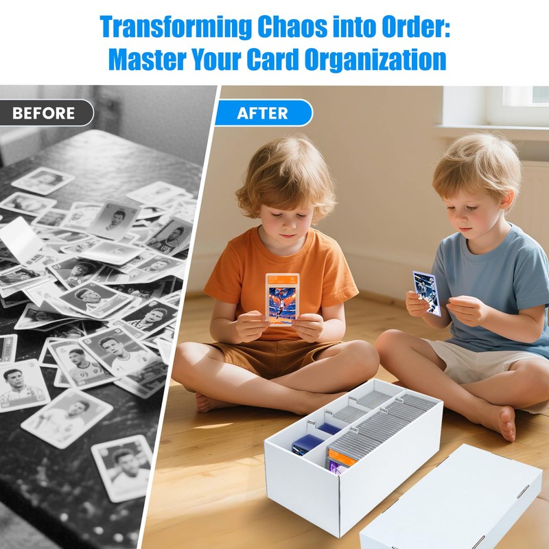 Each box includes dividers to separate different types of cards, labels for easy identification, and a comprehensive assembly instruction manual. These accessories make it easy to categorize and organize your trading cards (TCG, YGO, OPCG) and sports cards (basketball, soccer, baseball) in a way that suits you best. Whether you're sorting by card type, sport, or rarity, our box has got you covered.