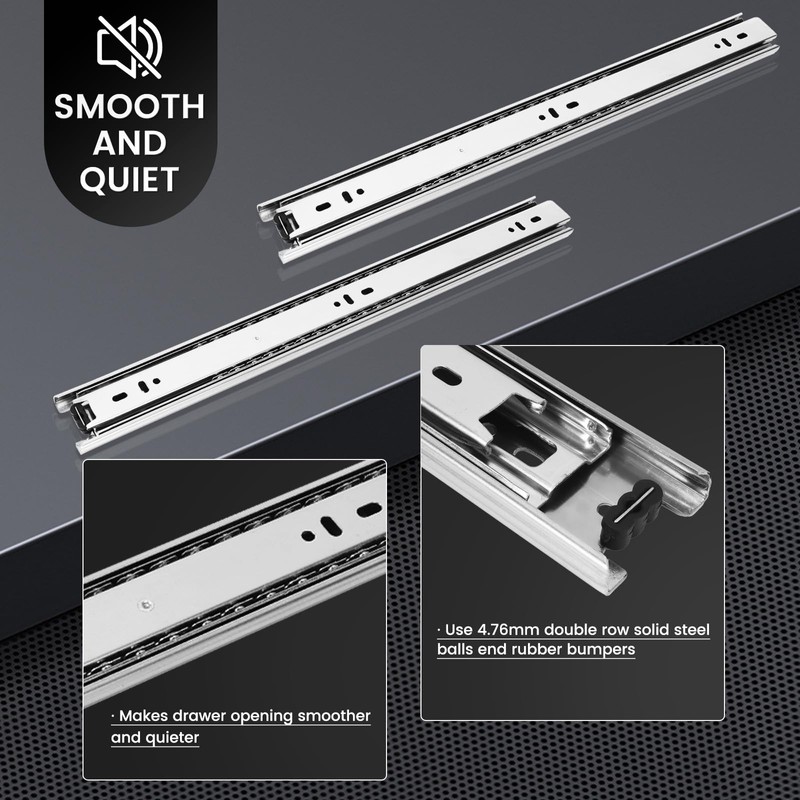 • 【Full Extension & Ball Bearing Design】— The drawer slides also feature a 3-fold full extension design, enabling them to fully open for easy access. You won't need to reach under the lip of your cabinet to access anything in the drawer, making this product perfect for those who need versatility in their furniture. Ball bearing design ensure drawer slides smoothly and silently.