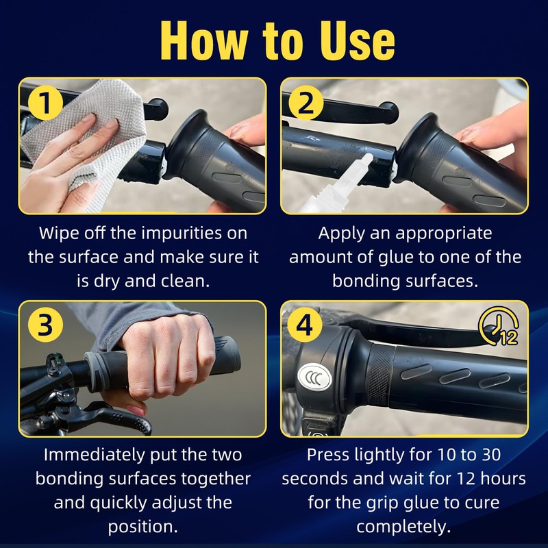 - 【Instructions For Use】First, wipe off the impurities on the surface with a wet wipe and ensure that the bonding surface is dry and clean. Second, apply an appropriate amount of motorcycle grip glue to one of the bonding surfaces. Then, immediately put the two bonding surfaces together and quickly adjust the position, usually only 5 to 10 seconds to adjust. Finally, press lightly for 10 to 30 seconds to ensure close contact, and wait for 12 hours for the grip glue for dirt bikes to cure completely