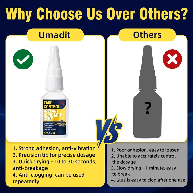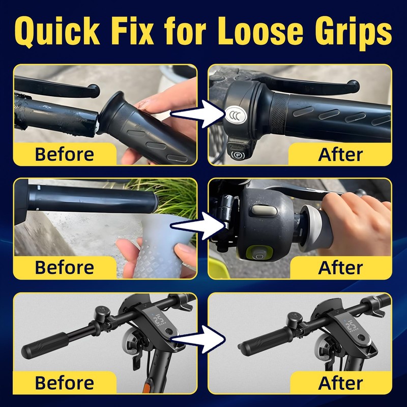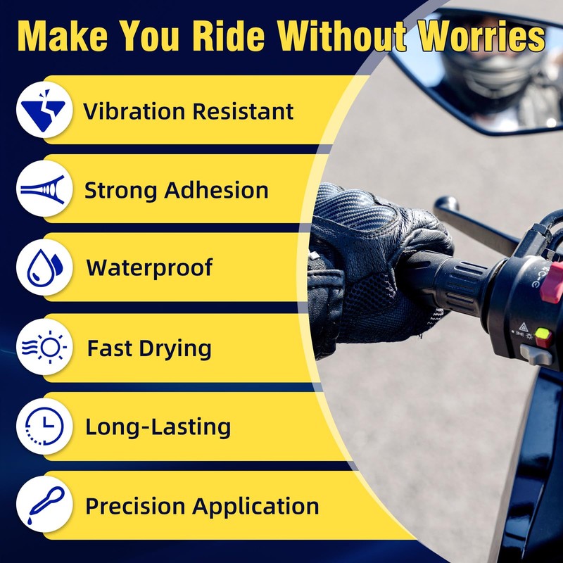 - 【Strong Adhesion And Fast Drying】This grip glue has a strong bond that can firmly fix the rubber grip, preventing the handlebars from loosening or slipping during riding, even under extreme vibration, off-road terrain or harsh conditions. The motorcycle grip glue can cure quickly, with a preliminary cure in 5-8 seconds, allowing you to quickly repair the handlebars so that you can ride normally