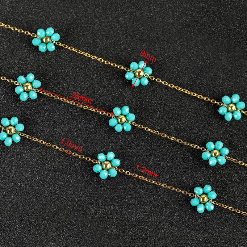 - Jewelry Chain Roll: You can get 3 meters blue cyrstal flower chains on a spool. The beads flower size is about 9mm wide, the length between two blue flowers is about 25mm; the cross link size is about 1.6mm long and 1.2mm wide. Proper size and sufficient quantity will meet any different jewelry making needs.