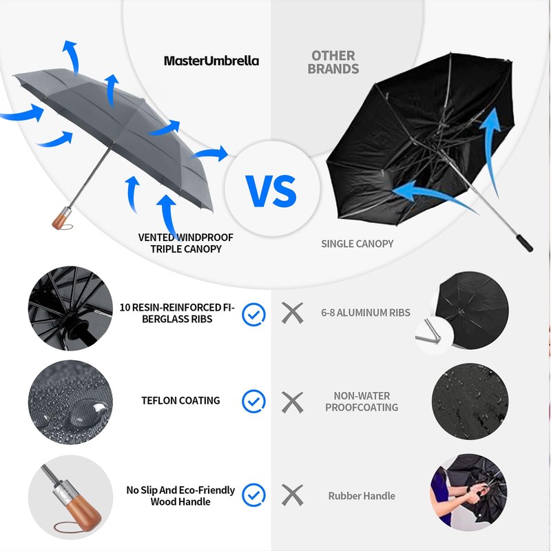 • Heavy Duty Umbrella: With 10 resin fiberglass ribs, our windproof umbrella offers exceptional durability, ensuring reliable performance even during the most challenging weather conditions, keeping you safe and dry from storms and gusts.