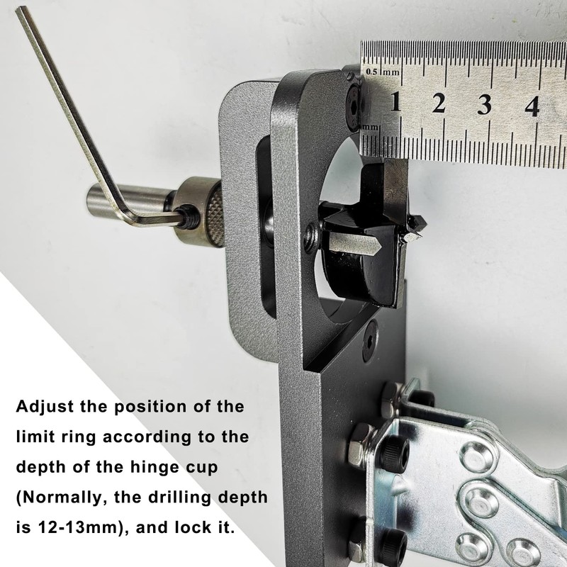 - Installation: 1. Install a 35mm hole opener; 2. Adjust the drilling depth to 12 to 13 mm and then lock the boundary ring; 3. Adjust the fixed size of the black pressure block of the quick release; 4. Move the hole punch to the marking and drilling position of the board and lock the quick clamp; 5. Tighten the handle of the drill, press the hole to a depth of 12 to 13 mm; 6. Drill a 2mm screw hole left and right.