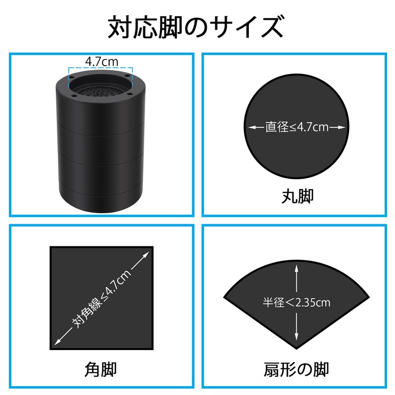 Suitable for: Round foot diameter is 1.9 inches (47 mm) (within the diagonal line of the square foot is 1.9 inches (47 mm) in), household appliances and furniture such as refrigerators, dishwashers, desks, beds, sofas, etc.