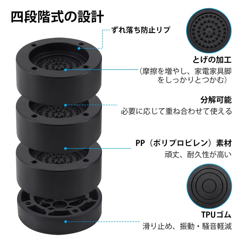 - Versatile: It can withstand a weight of 66.1 lbs (300 kg), and is highly stable. Size (W x D x H): 2.6 x 2.6 x 3.6 inches (67 x 67 x 92 mm) fits most household appliances and furniture legs. The color is invisible Suitable for: Vertical and drum type washing machines, refrigerators, dishwashers, tables, sofas, beds, kotatsu tables and other household appliances and furniture with a round foot diameter within 1.9 inches (47 mm) diagonal