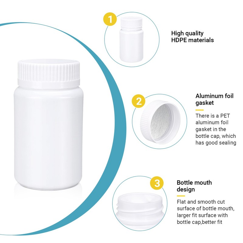 - Sealed Design: These white pill bottles are made of leak proof screw caps and equipped with aluminum foil gaskets. They can ensure the safe storage of medications and prevent spills. They are easy to open and close, convenient for both at home and travel use