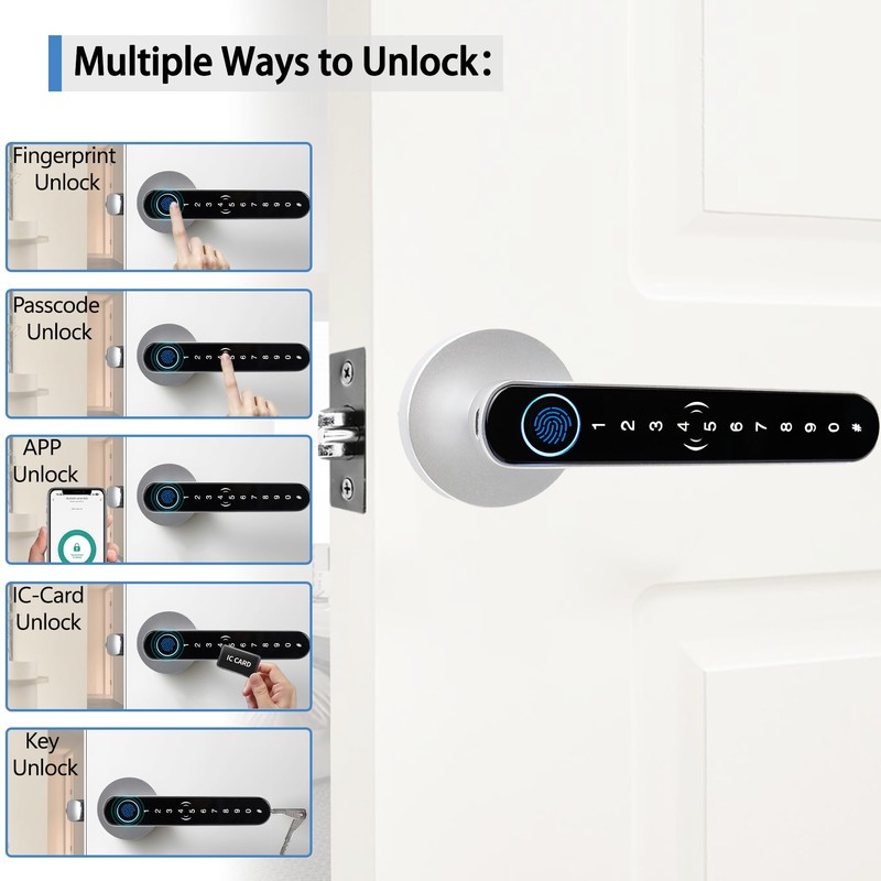 - Multiple unlocking options: Easily unlock using 5 ways: fingerprint door lock, Tuya app, IC card password and physical key. 1s Clock quickly identifies the unlock, Store 50 fingerprints for instant access and assign temporary codes for guests. While app control allows remote access. Perfect for bedroom door locks, interior door knobs