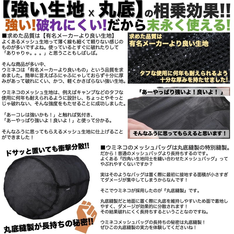 - ■ The quality you requested is [fabric better than a famous manufacturer] Strong fabric x a synergy effect on the round bottom. Strong! Tear resistant. So you can use it for a long time. The Umineko mesh fabric is designed to withstand years of tough use such as camping, and it has a strong strength that will not tear gently. Umineko uses "round bottom" stitching. The round bottom is sewn to make it easy to maintain the round bottom when placed on the ground, so it is easy to land on the surface and the damage is dispersed effectively. The result is less likely to tear and long lasting