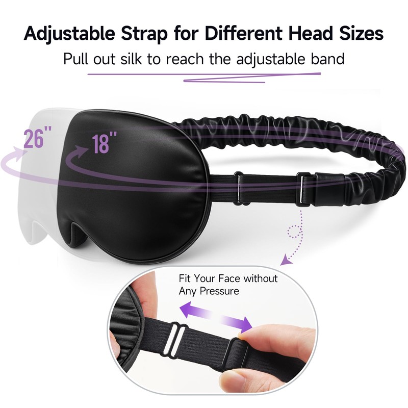 - Pain-Free Fit for All Head Sizes: The silk-wrapped elastic band effortlessly molds to your face without any pressure. Whether you’re a back, stomach, or side sleeper, this eye mask for sleep stays comfortably in place all night.