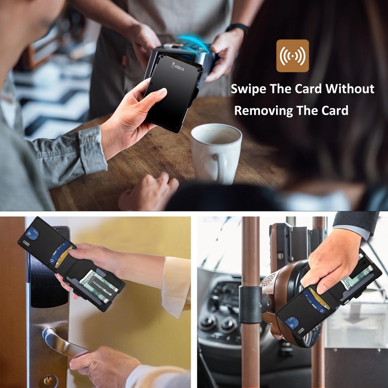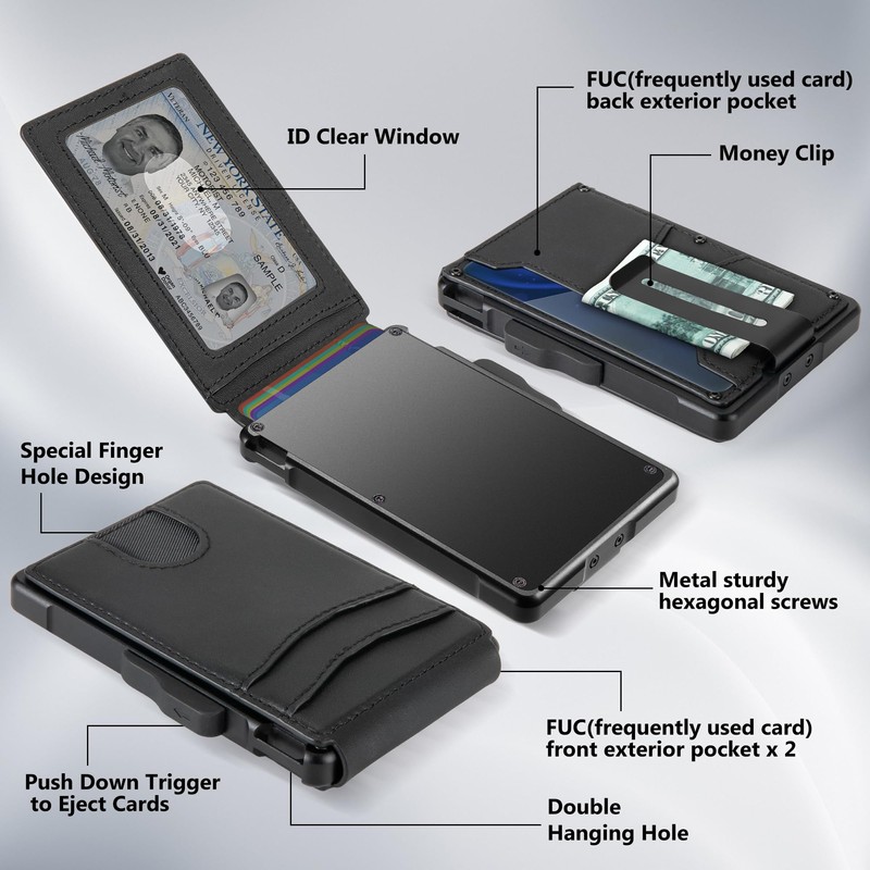 - 【Newly Design】: High quality PU that is made for the cover of the wallet was treated to be water-resistant. The aluminum wallet chamber make of premium metal with a smooth eject pop up feature, using the latest ergonomic design, easy slide the side button of the metal wallet and get the neat pop-up cards. Inner magnet in the PU cover allowing you to attach the cover and the chamber magnetically.