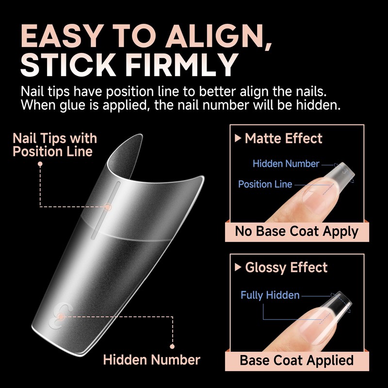 - EASY TO APPLY-These fake nails square come with a position line design, friendly to starter and professional to better alignment and adhesion. Pre-numbered marked on each false nail tips, you can quickly find the suitable size. You will receive pcs sizes medium square nails. Both delicate and practical, no harm to your nails, just to give you better professional nail care.