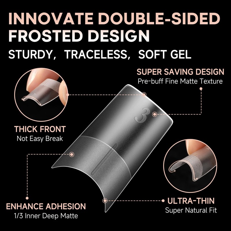 - NEWLY DOUBLE SIDE MATTE TEXTURE-Our medium square gel x nail tips upgraded double-sided frosted design. The surface pre-buff with fine matte for applying base coat gives a glossy look. And / inner pre-buff with deep matte for better adhesive nails. "Thick Front, Ultra-thin Back" design benefit of break-resistant and ultra fit. Let you enjoy this unprecedented professional nail salon enjoyment!