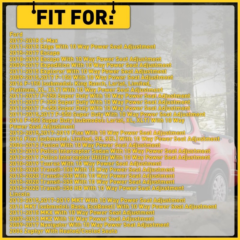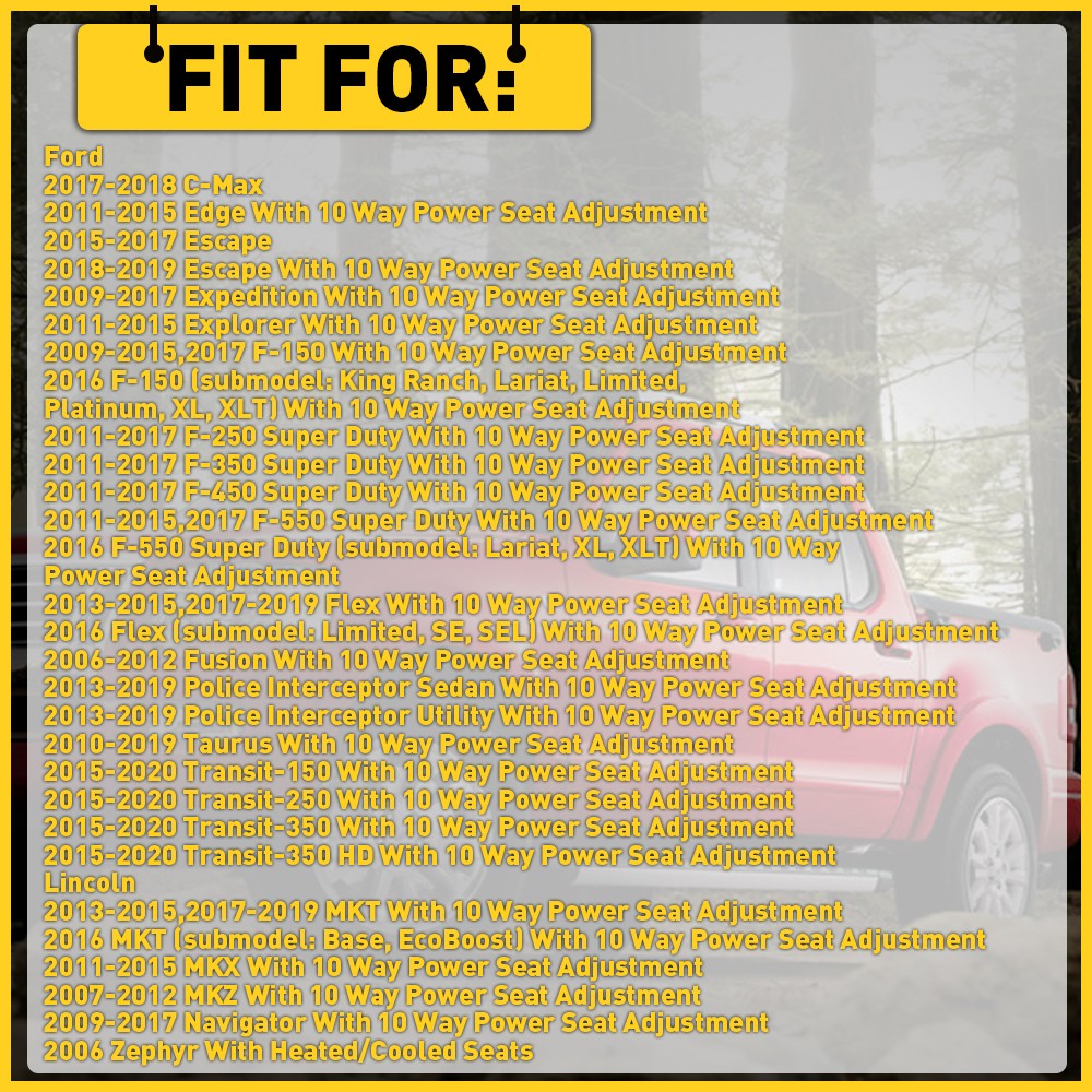 Fits for: Mercury Mountaineer 2006-2010 Lincoln MKT 2013-2019 Lincoln MKX 2007-2015 Lincoln MKZ 2007-2012 Lincoln Navigator 2007-2017 Ford C-Max 2013-2018 Ford Edge 2007-2014 Ford Escape 2013-2019 Ford Expedition 2007-2017 Ford Explorer 2006-2015 Ford Explorer Sport Trac 2007-2010 Ford F-150 2009-2014 Ford F-250 Super Duty 2011-2016 Ford F-350 Super Duty 2011-2016 Ford Flex 2009-2019 Ford Police Interceptor Sedan 2013-2019 Ford Special Service Police Sedan 2014-2018 Ford Taurus 2010-2019