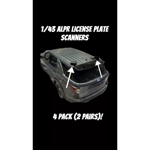 This listing is for a 2 pack (enough for 2 cars) of 1/43 License Plate Scanners or ALPRs. These will come printed and attached to a raft/tree. Separation from tree will be required before install (see photo) but simply pull them off and glue them on your model. These will add great detail to your next traffic unit!!