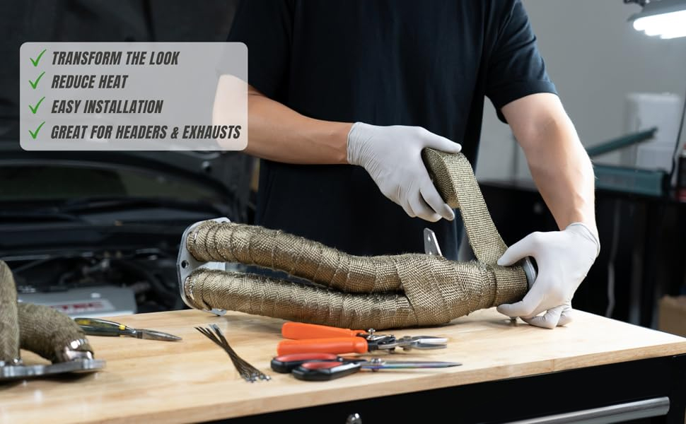 Our kit can be installed by anyone in the comfort of their garage. Comes with 10 stainless steel metal zip ties, 50 feet roll exhaust wrap