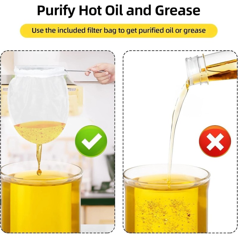 ---With a convenient filter bag, this oil caddy easily separates impurities from used oil, prolonging its life and maintaining a clean cooking environment.