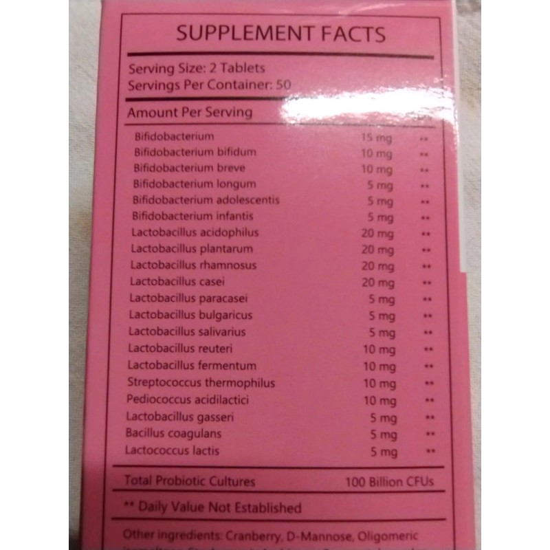 Expiration Date: 2025-12-31 | Unit Quantity: 100 | Active Ingredients: D-Mannose,Probiotic,Cranberry | Formulation: Tablet |
