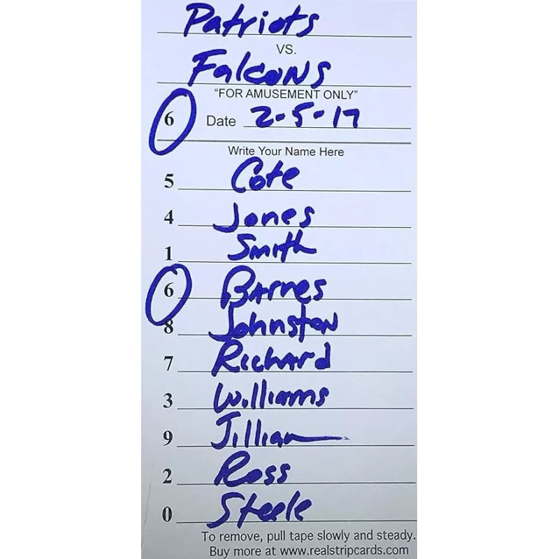 · IS THIS YOUR GAME TOWIN? Have a blast with your friends and add excitement to the game. Are youlooking to fundraise for your VFW or Charity? These 10 line sports strips cardsare a great way to get ¬-everyone engaged. Easy to play and win. Simply followthe included instructions and once ready; pull the removable, opaque, blackstrip to show the winning numbers. Similar to the common SuperBowl Squareswhere you write in the names of your friends and at the end of the quarter, etc– you see w