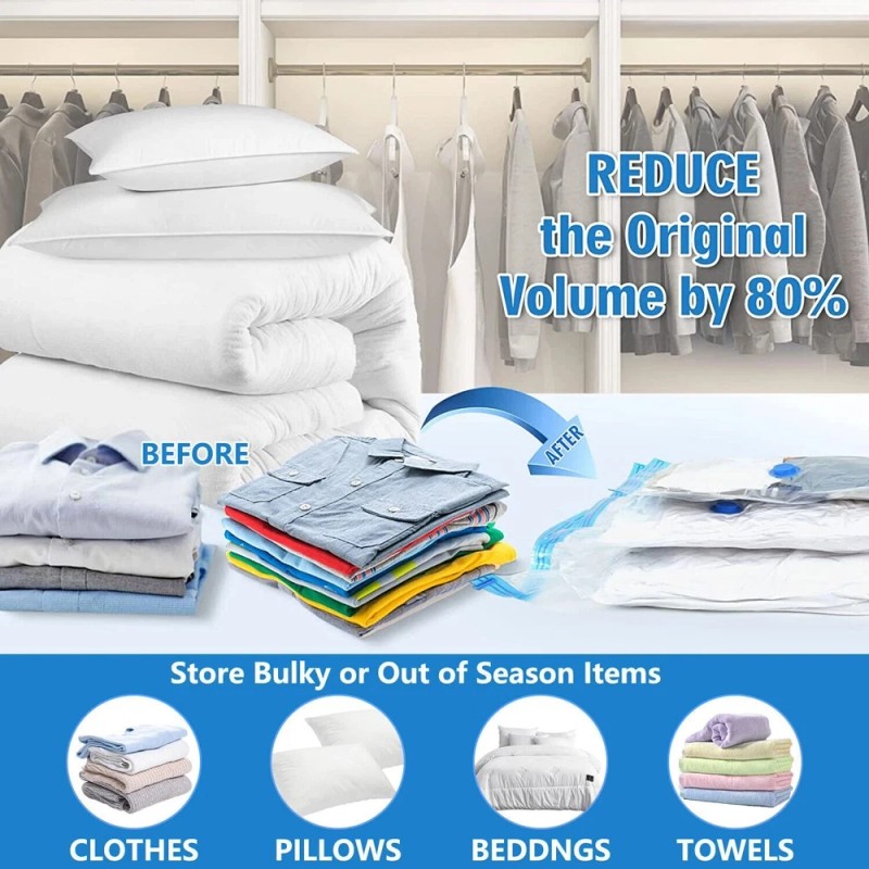 - Maximize Storage Space: Our vacuum storage bags increase your storage capacity by up to 80%, making them an excellent solution for maximizing wardrobe, loft, and suitcase space. Ideal for clothes, comforters, pillows, duvets, beddings, and more.