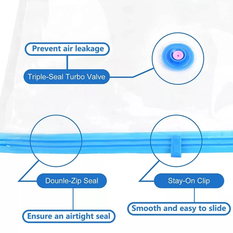 - Long-lasting Protection: With robust double-zip sealers and triple-sealed turbo valves, our space-saving bags effectively vacuum out air and stay compressed and fresh, providing effective, long-term storage.