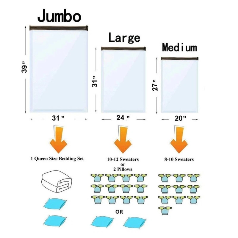 - Comprehensive Combo Pack: This pack includes 2 jumbo bag (39 x 32 in) suitable for a bedding set, 5 large bags (24 x 32 in) for two pillows, 5 medium bags (28 x 20 in) for 8-10 pieces of clothes/towels