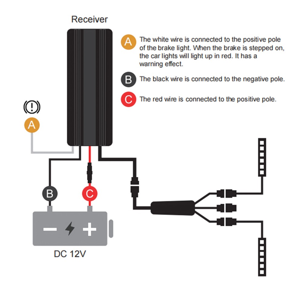 Wire connection: Black wire to negative Red wire to positive White wire to brake light When you turn on the brake light, the whole strip will turn red
