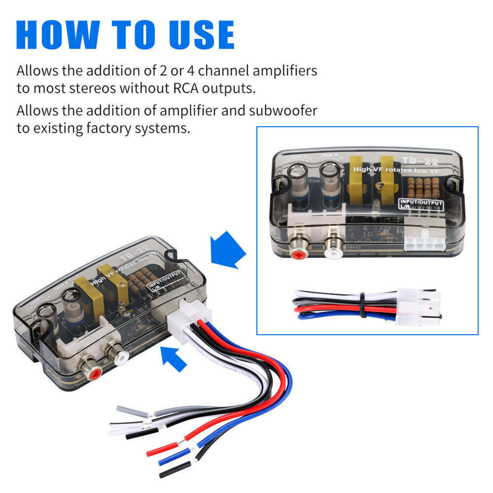 Speaker level converter allows adding amplifiers and subwoofers to existing factory systems.