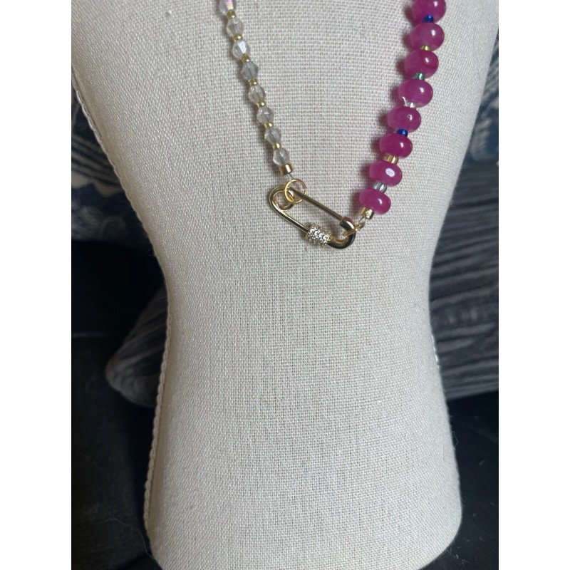 This 16” Candy Necklace is a stylish beaded necklace featuring a round pendant with a main stone width of 8mm. The necklace is made with natural gemstones that have a good cut grade and are heavily included. The charm pendant adds a unique touch to the piece, making it a fashionable accessory for any outfit. Perfect for those looking for a personalized yet straightforward necklace without any antique or customized elements.