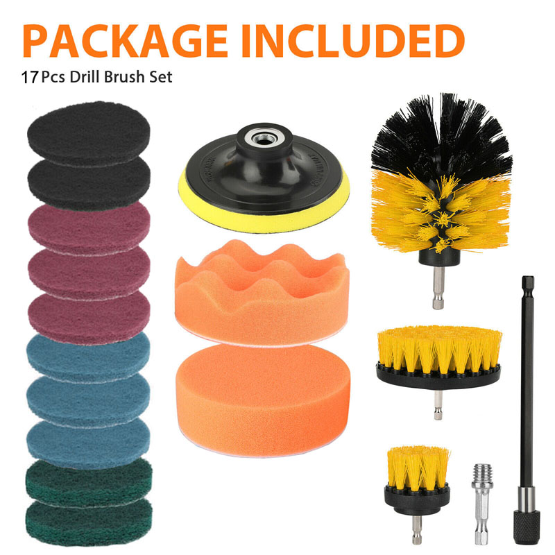 17 Piece Drill Cleaning Attachment Set, Includes: 3 shape of Medium drill power scrubber brushes, 10 Piece different stiffnesses Scouring pads, 2 Piece scrub sponge, 1Piece 4 inch backer with adapter,and 1 Extension rod.