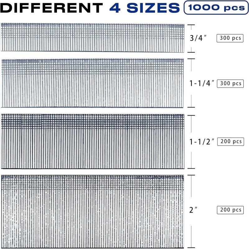 - 【Various 4 sizes 】Include the brad nails with 4 different sizes, 3/4 inch, 1-1/4 inch, 1-1/2 inch and 2 inch, Per stick: 100. The multi-size assortment will meet most of your fastening needs.
