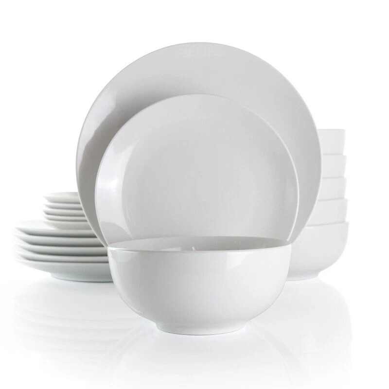 Set: 18 Pieces Construction: Porcelain Service For: Six Color: White Microwave Safe Dishwasher Safe Includes: Six Dinner Plates Six Salad Plates Six Bowls Per Item Dimensions: Dinner Plate: 10. 25" Diameter, 1" Height, 1. 11 lbs Salad Plate, 8" Diameter, 1" Height, 0. 12 lbs Bowl: 6" Diameter, 2. 75" Height, 22 fl. oz. , 0. 15 lbs