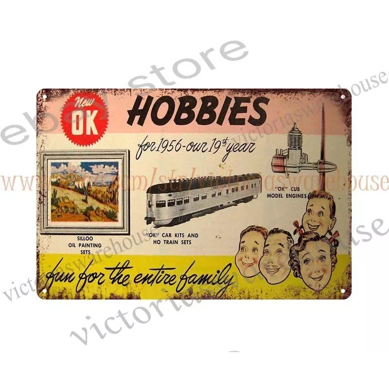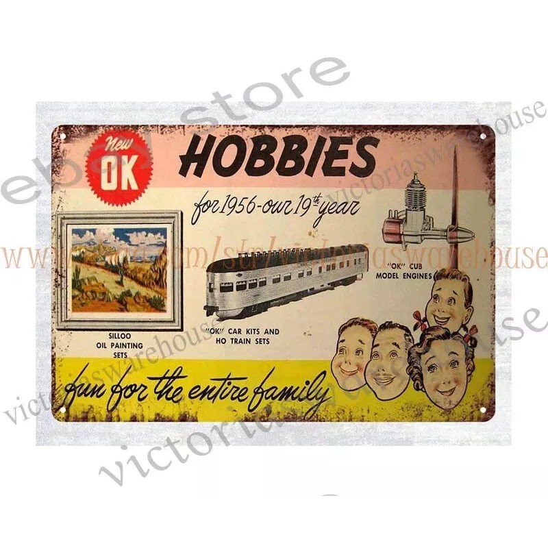 UNBRANDED 1956 OK HOBBIES Toy Model Airplane Motors Trains railway railroad metal tin sign