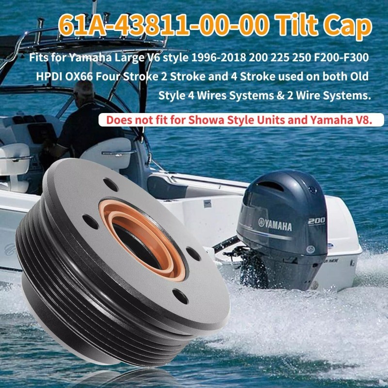 【PERFECT FITMENT】This tilt end cap fits for Yamaha Large V6 style 1996-2018 200 225 250 F200-F300 HPDI OX66 Four Stroke 2 Stroke and 4 Stroke used on both Old Style 4 Wires Systems & 2 Wire Systems. And please make sure the correct model before purchasing. *Attention*--Does not fit for Showa Style Units and Yamaha V8.