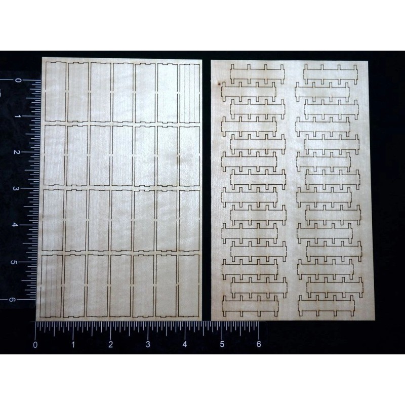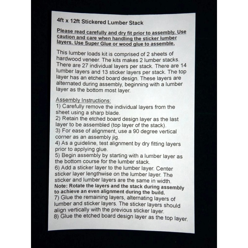 Offered is a precision laser cut kit to make 2 (two) HO Scale 2” x 12” board lumber stacks measuring 12ft long and 4ft in height. These are made from 0.022” thick hardwood, making them as true-to-scale as reasonably possible. The thickness of 0.022” HO Scale equals 1.91” in the “real world”. The kit contains 56 pieces: 28 lumber layers and 28 sticker layers. Only 24 pieces is required per stack to obtain the height of 48 HO Scale inches. The kit contains extra lumber layers.