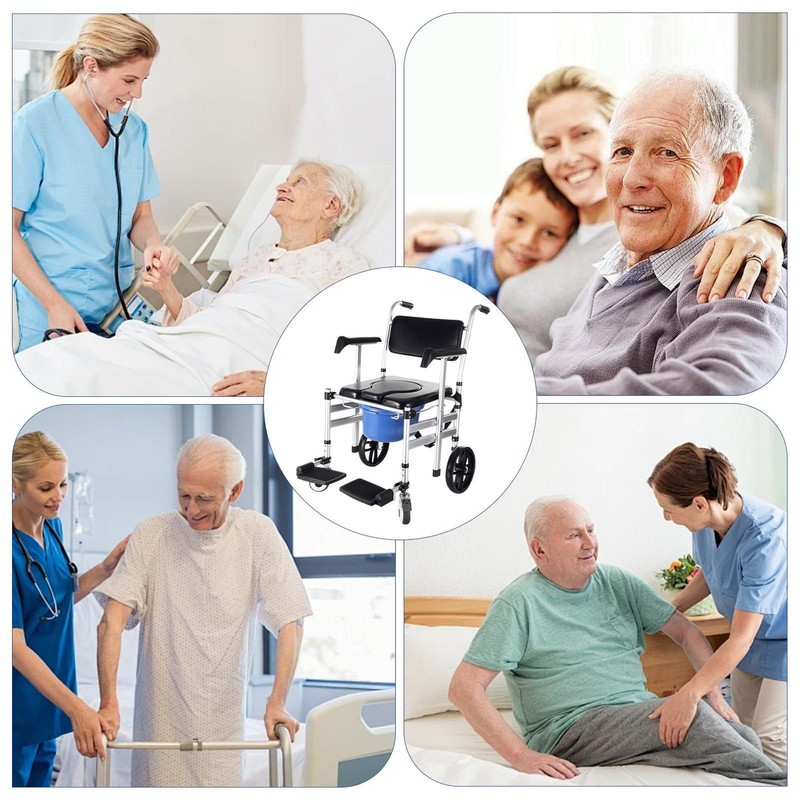 Ease of Use and Versatility: By integrating toilet, bathing, and assisted mobility functions, our shower chair with wheels cleverly conserves space and assures easy storage, making it perfect for home, nursing home, and travel