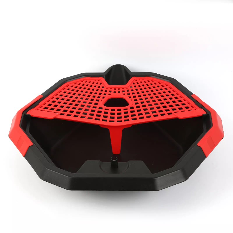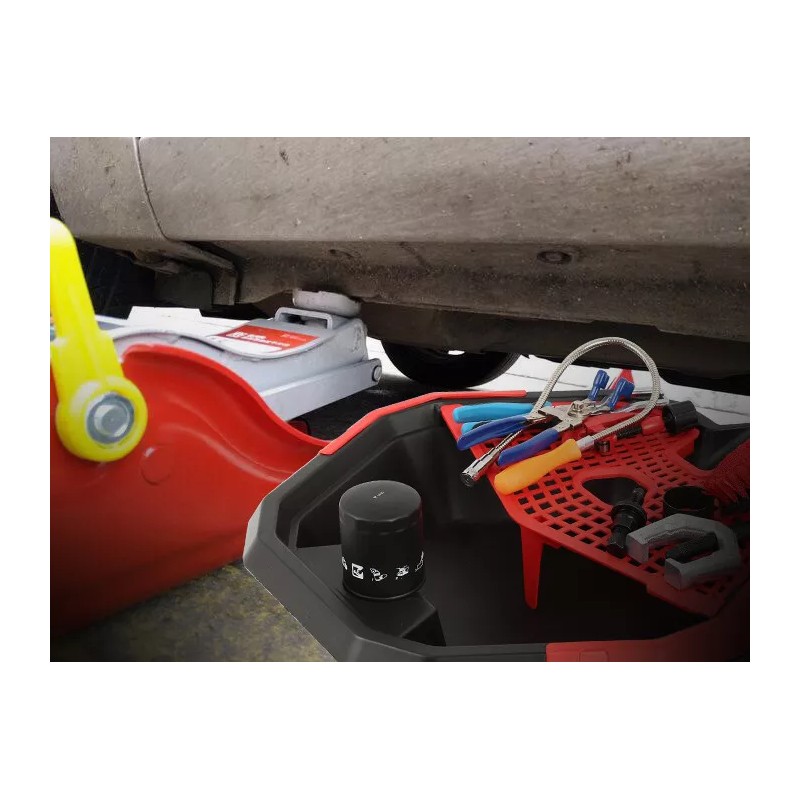 Unique splash guard and oil filter drain post on an 8 liter drain pan, perfect for any shop. Use this versatile tool caddy when working on wheels, brakes, suspension and much more