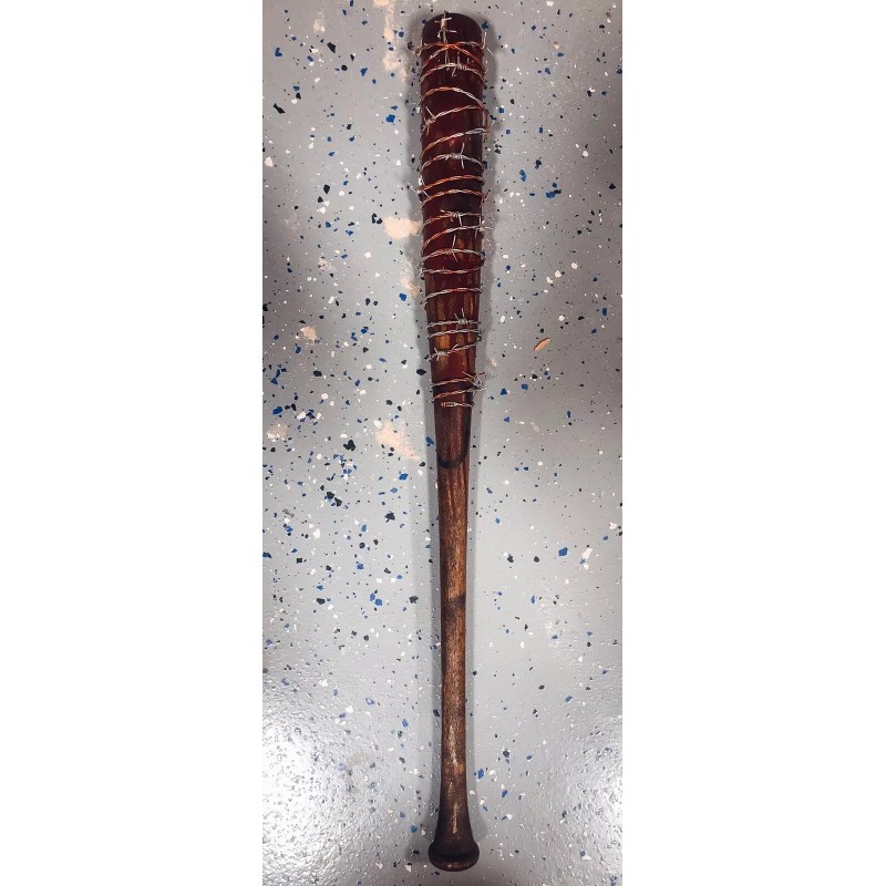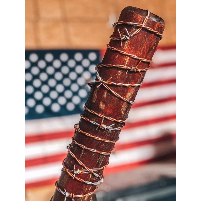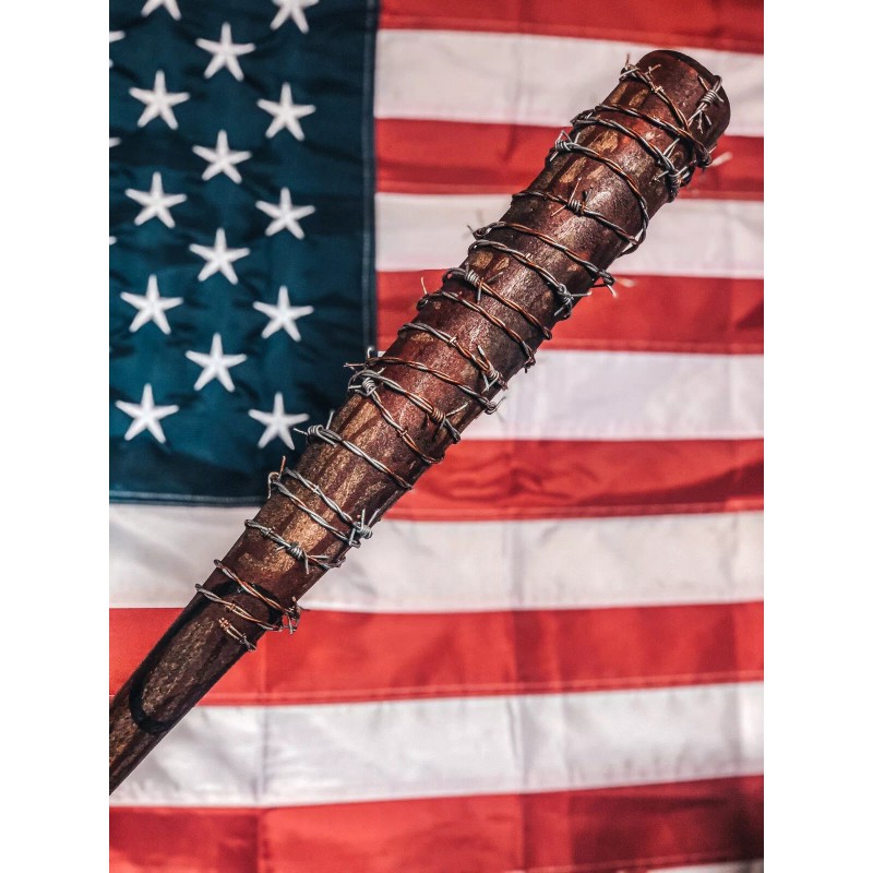 Listed is are 2 Lucille replica bats. These have the word LUCILLE Engraved in the middle of the bat. These bats are not perfect replicas, but are very similar. These are 32-34 inch ash or maple baseball bats that have been stained to achieve a look very similar to Lucille. Next it is wrapped in over 10ft of barbed wire then splattered with fake blood 🩸 to achieve a look of being used in the Apocolypse. These props could be very dangerous so we are not responsible for any injuries that may occur when receiving these bats . They are made of real Barbwire and real baseball bats!. THESE ARE NOT TOYS! Awesome props!