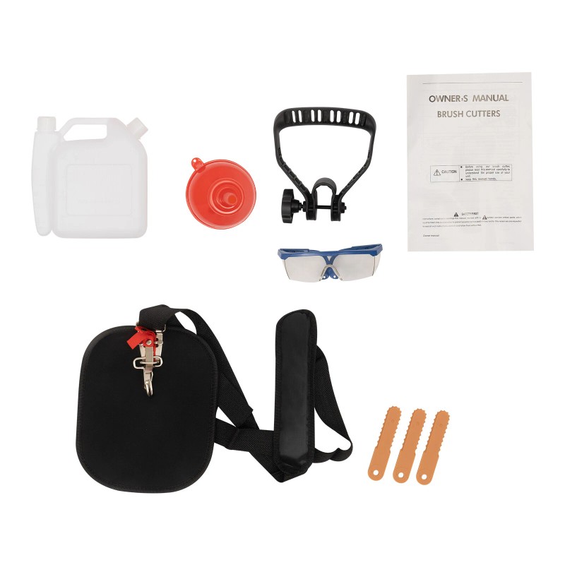 2. Please check whether the blade tool is firmly installed before starting the engine, and check whether the blade tool is intact after each work. When starting the engine, personnel need to stay away from 32.81ft or more. Please wear gloves(not included) and goggles during use.