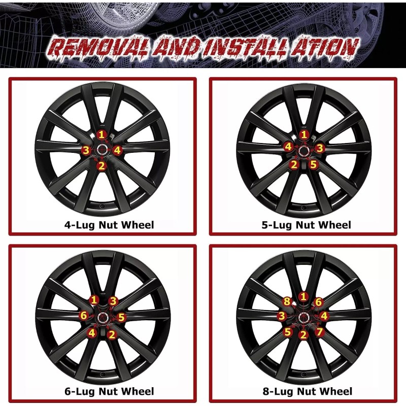 - 3. All nuts should be hand started and thensecured in a criss-cross sequence with a torque wrench and socket. Refer to your vehicleowner's manual or wheel manufacturer's guide for propertorque specifications. 1/2mm Lug size should use 70-80 torque