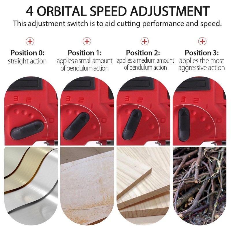 - 【4-Position Orbital & 45°Bevel】 4 built-in customized orbital settings from 0 to 3, in order to fit different type of cuts and materials; 0°- 45°bevel cutting could satisfy majority of demands in the job site, such as curve, straight line and slant cutting.Durable Aluminum surface plate can greatly reduce vibration during cutting.