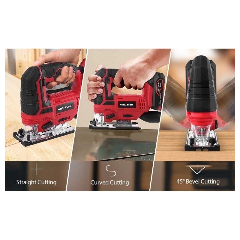 - 【Safety Lock & Tool-Free Design 】Jig Saw contains with safety lock and tool-free blade change designs.The lock button on the handle can lock the trigger for controlling the saw without keeping pressing it, which reduces hand fatigue in your job site.Quick release chuck allows for quick and tool-free blade removal for increasing efficiency.