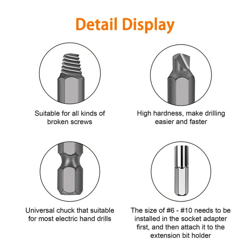 1. Screw extractor is made of high quality High-Speed Steel 4241. High hardness, durable and easily remove damaged screws