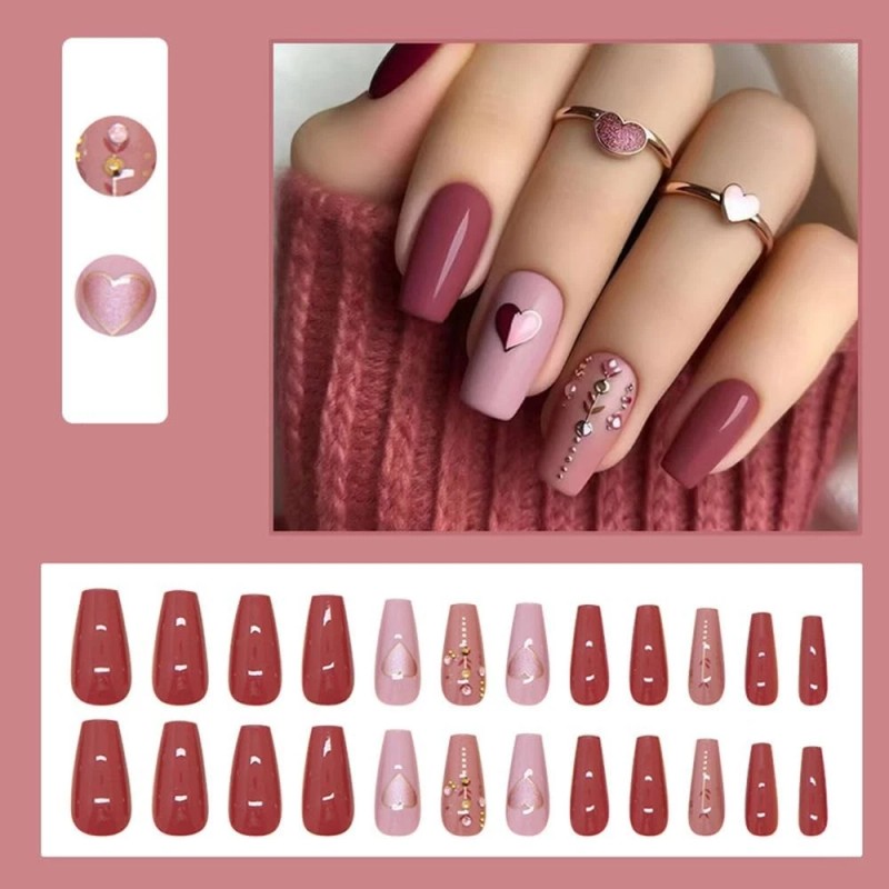 24 Pcs Wine Red Press on Nails Medium Square - Pink Fake Nails Press ons Fall Winter French Nail Art Tips Full Cover Acrylic False Nails Glue on Nails Kit with Rhinestone Heart Design for Women