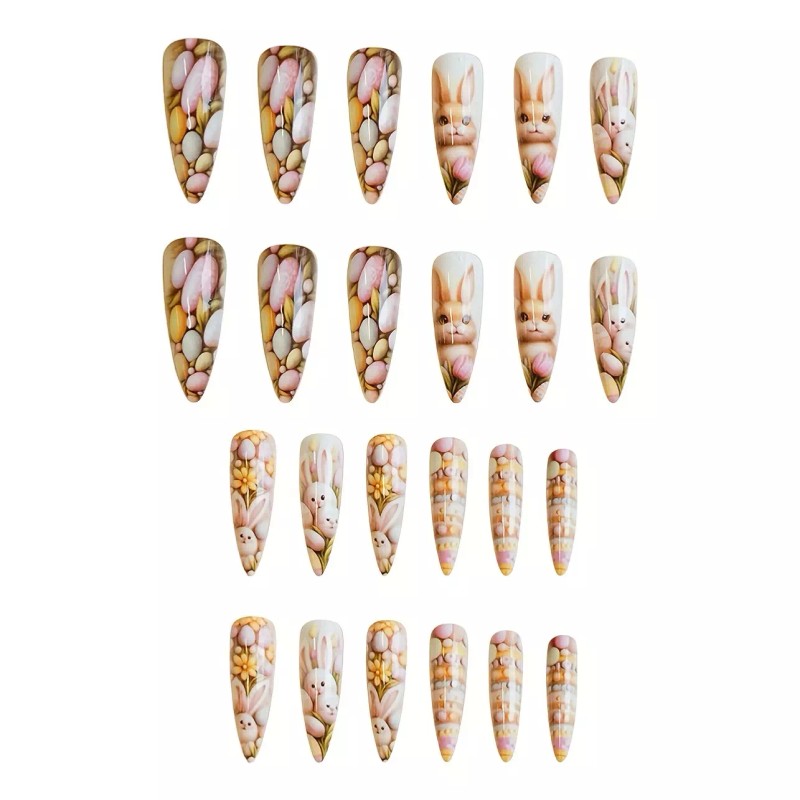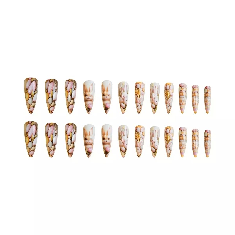 Unbranded 24pc Cute Pastel Easter Press On Nails Bunnies Eggs Long Stiletto ReusableGlossy