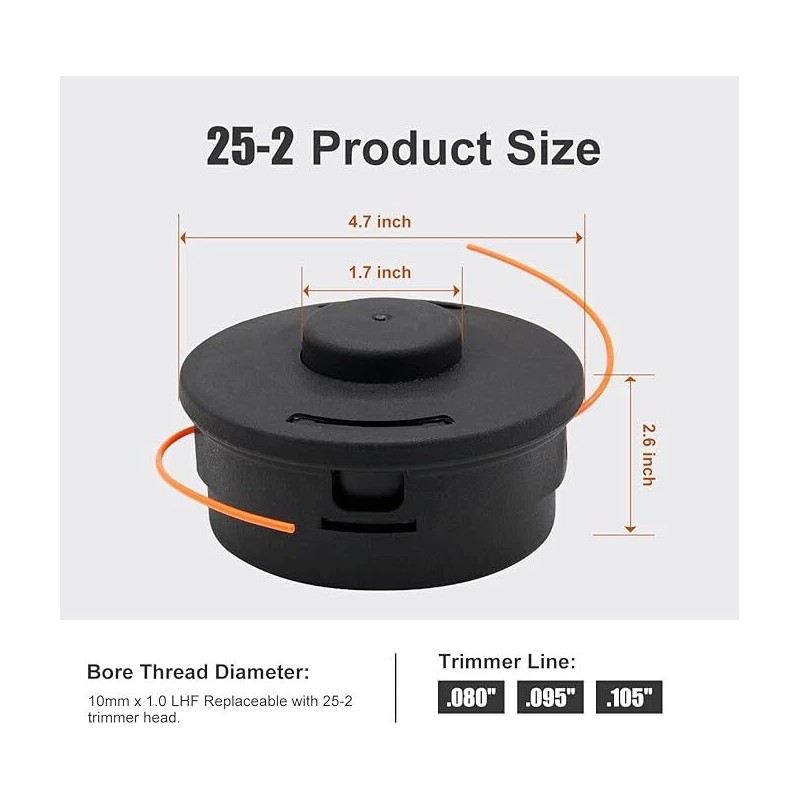 - Comes pre-loaded with .095"(2.4mm) line for immediate use, Can Use .080", .095", or .105" Trimmer Line