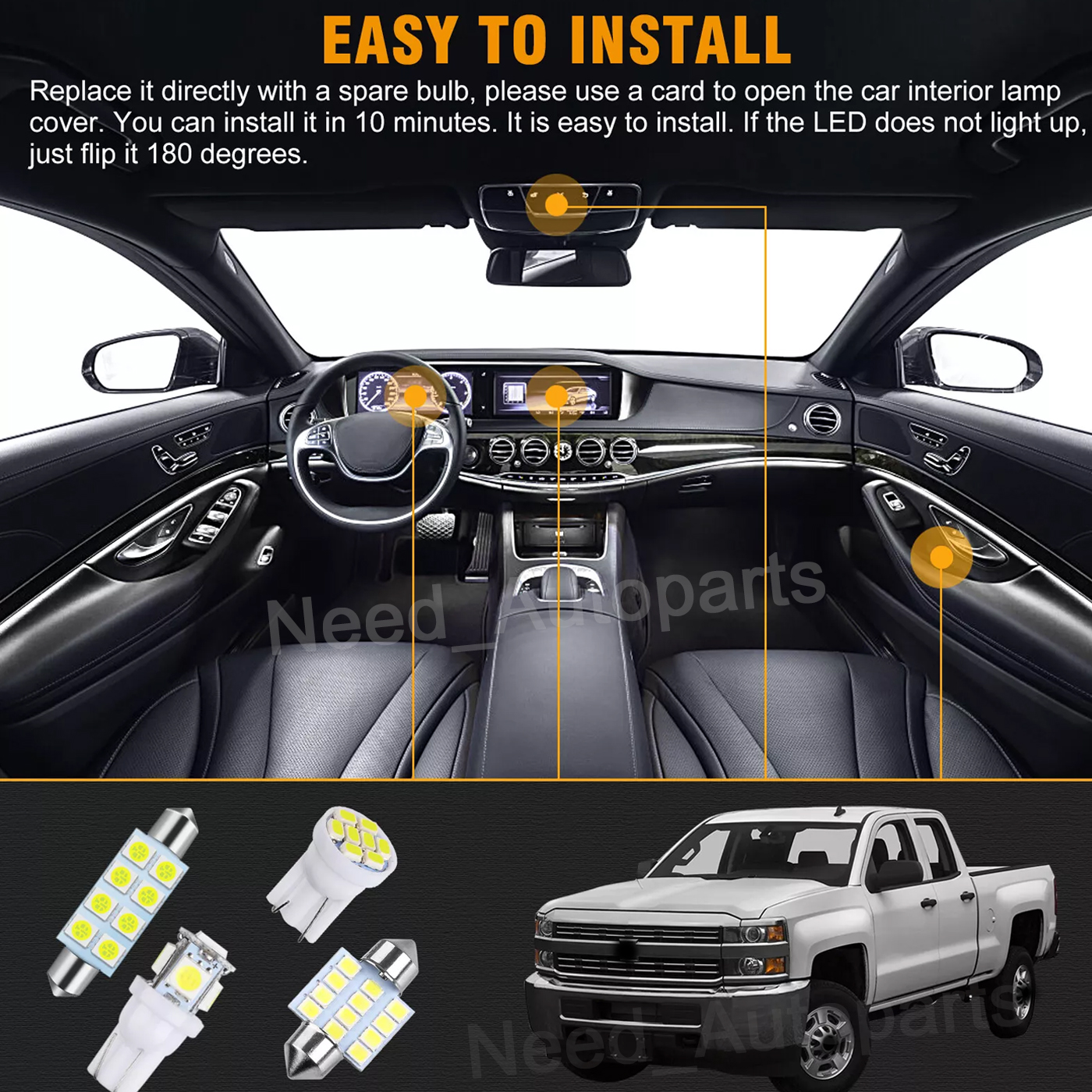 This Interior xenon white LED Kit Will Include the Following bulbs for applications around the interior of your vehicle, such as Dome, Map, Door, Glove Box, License Plates Etc.