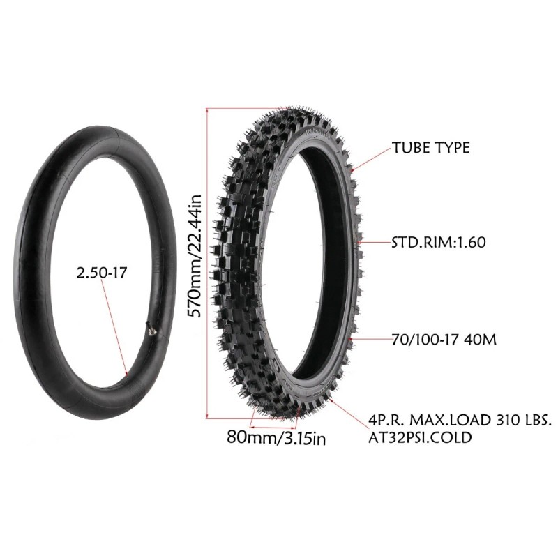 70/100-17 17 inch Front Tyre Tube FOR Motocross Trail Dirt Bike Item has been know to fit: Package includes 1 tire+ 1 tube |